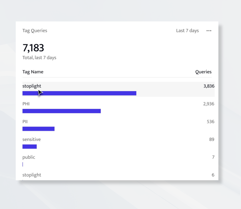 The Tag Queries metric highlights queries against sensitive data, giving you direct visibility into who is touching what. Combined with ALTR’s data classification and access control features, it provides end-to-end insight into sensitive data usage.