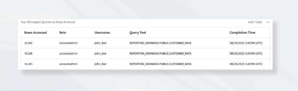 Use Case: An analyst runs an ad-hoc query against a production dataset and unintentionally retrieves all customer records. The dashboard helps you catch that immediately.